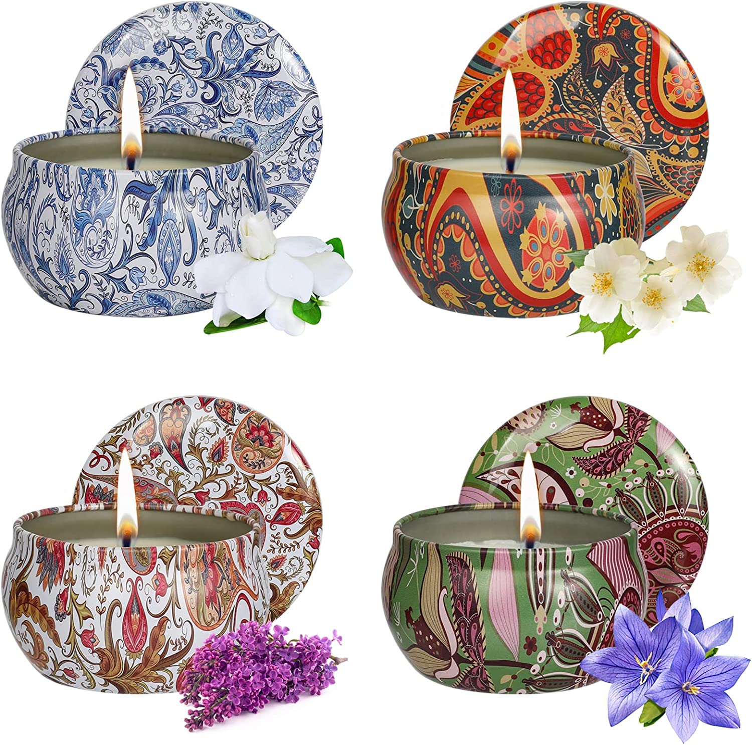 -❀4 Pack Scented Candles Set:The candles gift set includes 4 enchanting fragrances: Jasmine, Gardenia, Lilac, Blue Bell.You can use different scents according to different moods.Light the flame,the rich,enchanting fragrances will help clean and purify the air,soothe emotions and relaxation mood.