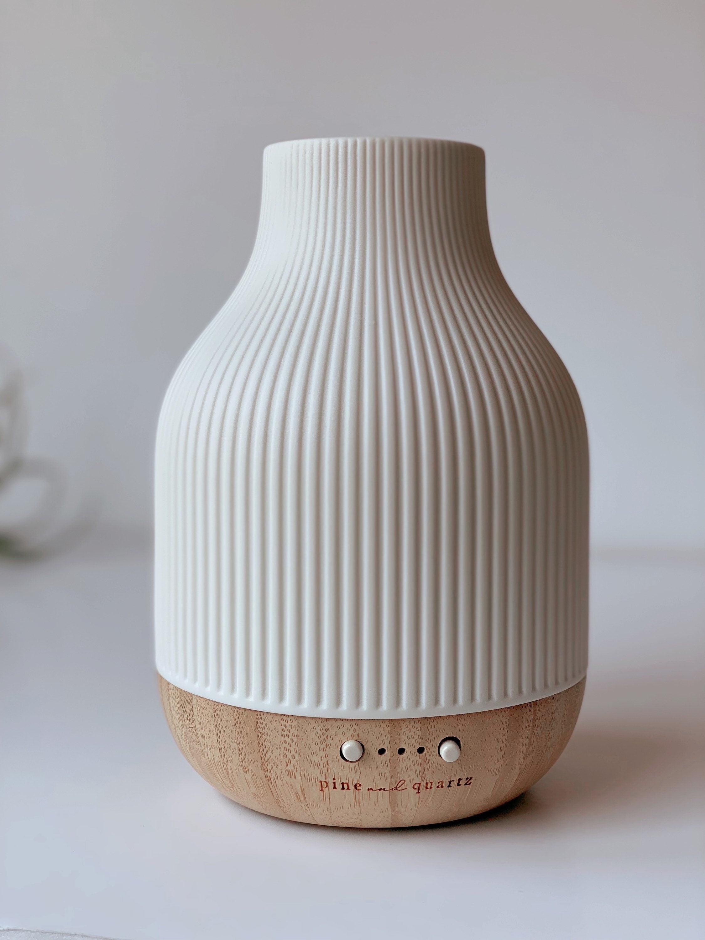 PLEASE READ THROUGHLY BEFORE PLACING ORDEROur Pine and Quartz essential oil diffuser is not only perfect for aroma therapy it is also esthetically pleasing and will double as an accent piece in your home. Our diffuser is made with handcrafted bamboo, handmade ceramic cover, and has a BPA-free reservoir. The black and white base diffuser is made from real rubber wood. It has the capability to mist for 8+ hours and will automatically shut off when the water runs out. Details: *Handcrafted Bamboo Base*Handmade Ceramic Cover*BPA-Free Reservoir *Warm Breathing Light Additional Features: *Mist Timer (1 hr, 3 hr, 8 hr )*Mist modes ( Continuous/intermittent)*Light Settings (Bright, Dim, Multi-Mode/Breathing Light, Independent night light)*180 ml water capacityApproximate Dimensions: 7.5x5x5Instructions: 1. Remove cover and inner lid.2. Fill water reservoir to or below max water mark level. 3. Add 3-5 drops of your preferred essential oil.4. Feel the stress melt away! What's In the Box:1 Ceramic Cover,1 Inner lid1 Bamboo Base with Reservoir 1 US Power Cord1 User ManualThis diffuser works best when connected directly to the power outlet and not a power strip. All diffusers are tested by me before they are shipped but you have 7 days from date of delivery to test your diffuser and make sure everything is working properly. Please keep all packaging incase it needs to be returned. A restocking fee will be charged if packaging is missing.